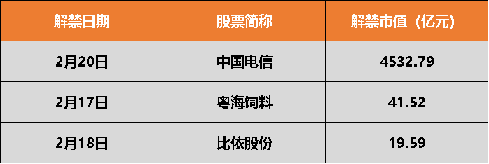 具体来看,中国电信2月20日解禁573.77亿股,粤海饲料2月17日解禁4.81亿股,比依股份2月18日解禁1.16亿股,均为首发原股东限售股份。